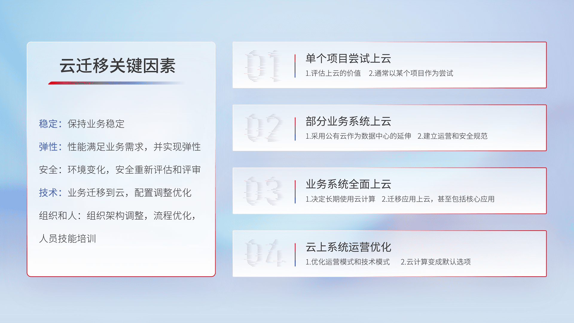 结合实际业务,,,,从规划设计、、、、云平台选型、、云原生改造、、、数据迁移、、、、集成交付,,,迁移全过程为客户识别最佳上云路径,,,做好风险识别管理,,,,设计网络架构、、身份权限、、安全审计合规、、、操作审计、、日志审计、、监控告警策略、、多站点容灾设计等,,,,对云上基础设施进行整体规划,,,提升IT治理水平,,以满足弹性、、、、高可用、、、高性能的需求。。。。