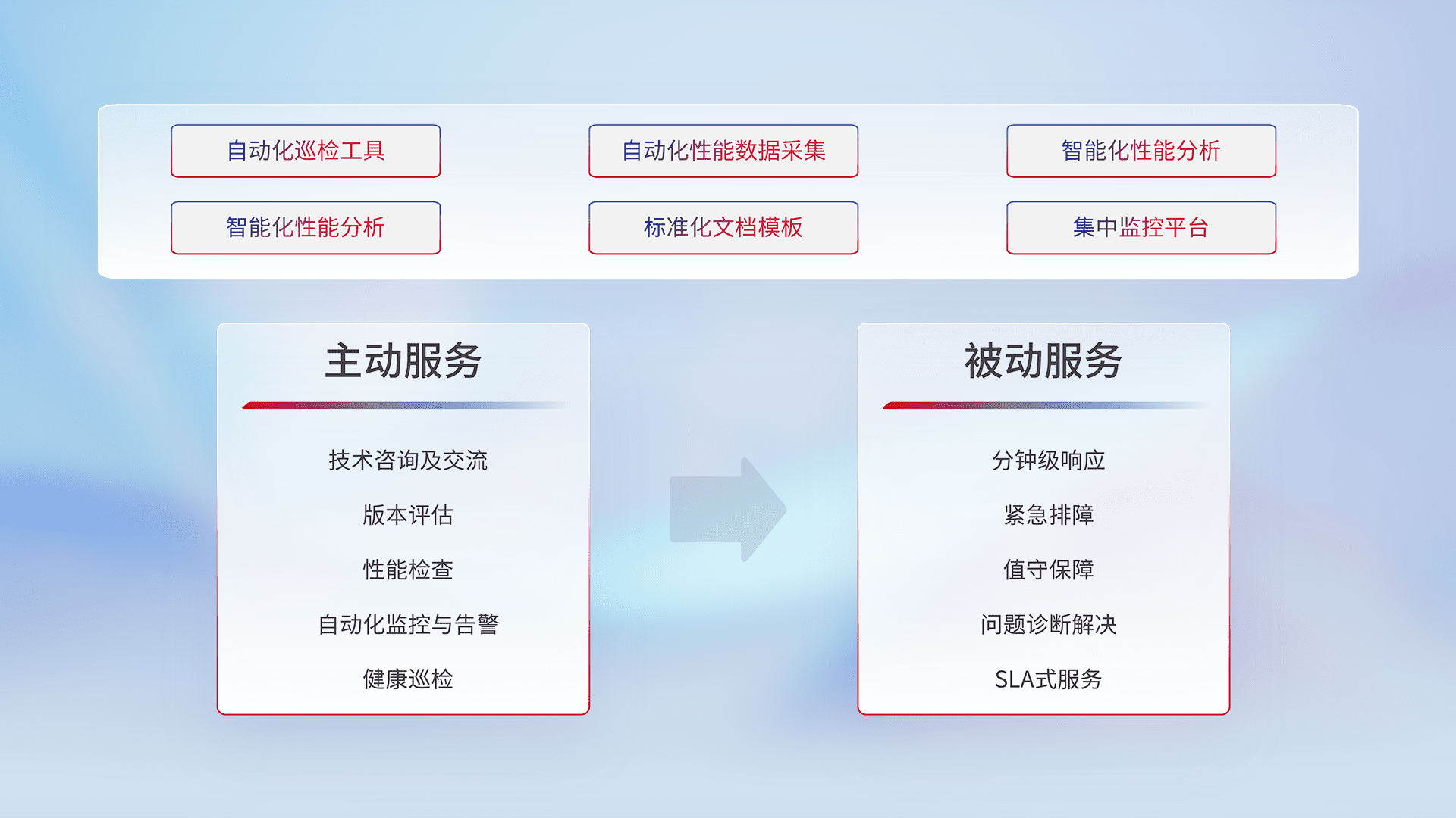 智能化工具和标准化文档,,,,保障服务质量,,,,提供主动服务(包含技术咨询、、、版本评估、、性能检查、、自动化监控与告警、、健康巡检)和被动服务包含(分钟级响应、、、、紧急排障、、、值守保障、、、问题诊断解决、、、、SLA服务)。。。